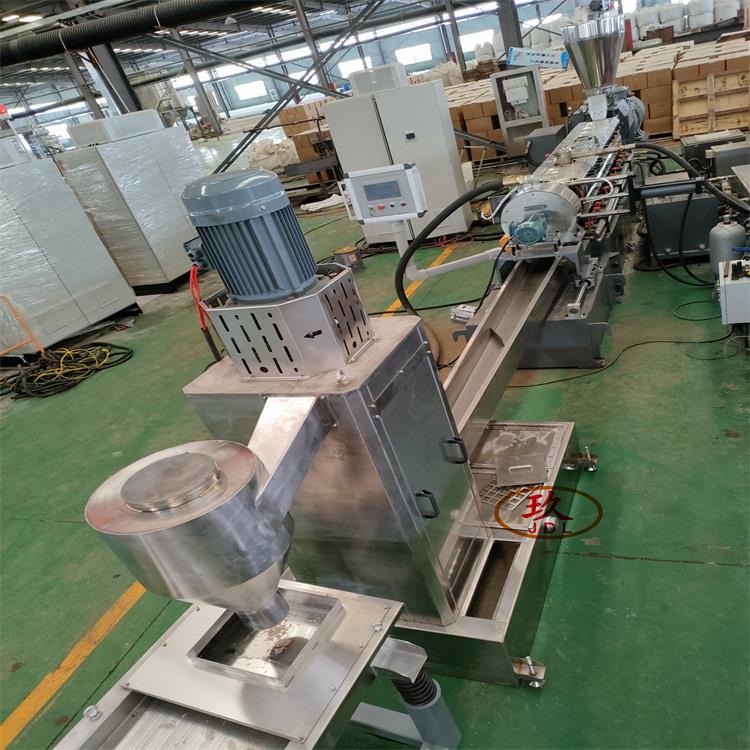 造粒工艺:双螺杆计量式喂料——-JDL-75D双螺杆挤出机----——液压板式换网——水环热切模头------水泵-----离心脱水机------2.5米加长振动筛-----风冷成品料仓----- -主机采用:PLC控制